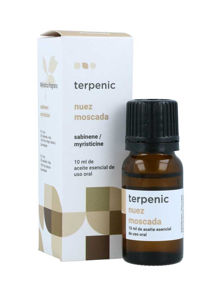To πόσιμο αιθέριο έλαιο Nutmeg της εταιρίας terpenic labs είναι ένα εξαιρετικό προϊόν με σημαντικές θεραπευτικές ιδιότητες. Με την έντονα αντιφλεγμονώδη δράση του μπορεί να ανακουφίσει κάθε είδους πόνο, μυϊκό και ρευματικό. Επιπλέον, ενισχύει το καρδιακό και πεπτικό σύστημα, τονώνει την κυκλοφορία και δραστηριοποιεί τον νου, απαλείφοντας την πνευματική κόπωση. Είναι τονωτικό της όρεξης, ενώ φαίνεται ότι καταπολεμά αποτελεσματικά τη ναυτία, τον εμετό, τη δυσκοιλιότητα, αλλά και τη διάρροια. Επιπλέον, θεωρείται ισχυρό αφροδισιακό, καθώς πιστεύεται ότι μειώνει τη ψυχρότητα και την ανικανότητα. Τέλος, χρησιμοποιείται για τον πονόδοντο, τη κακοσμία του στόματος, αλλά και ως ένα εξαιρετικά αποτελεσματικό βοήθημα για ανάνηψη από λιποθυμία. Τόπος προέλευσης: Ινδονησία.