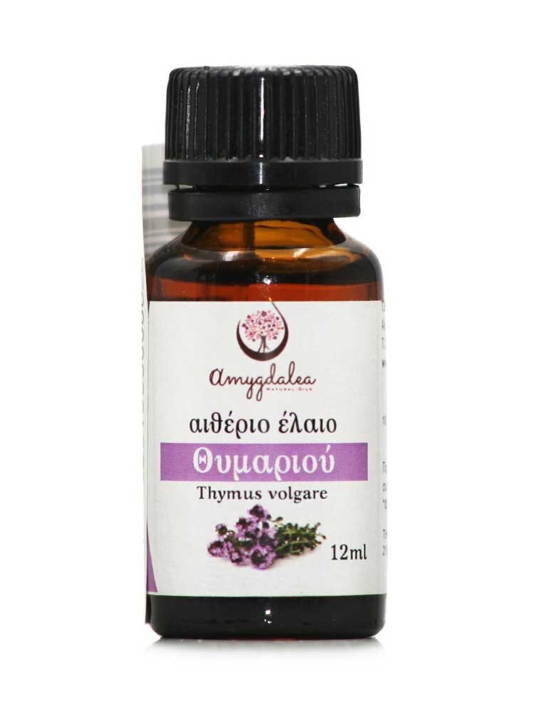 Το αιθέριο έλαιο Θυμαριού της amygdalea προέρχεται από απόσταξη ατμού των φύλλων και ανθών του και έχει ένα δροσερό, βοτανικό άρωμα. Παρουσιάζει έντονη αντισηπτική και αντιβακτηριακή δράση καθώς περιέχει την ουσία Thymol, το κύριο συστατικό των περισσότερων σύγχρονων στοματικών διαλυμάτων. Χρησιμοποιείται κατά κύριο λόγο για τη περιποίηση μελανιών, τραυμάτων, εκδορών, πρηξιμάτων και δερματικών μολύνσεων, αλλά και για τη περιποίηση της επιδερμίδας που υποφέρει από δερματοπάθειες, ακμή, εκζέματα και ψωρίαση, καθώς και για εντριβές σε περιπτώσεις μυοσκελετικών πόνων.