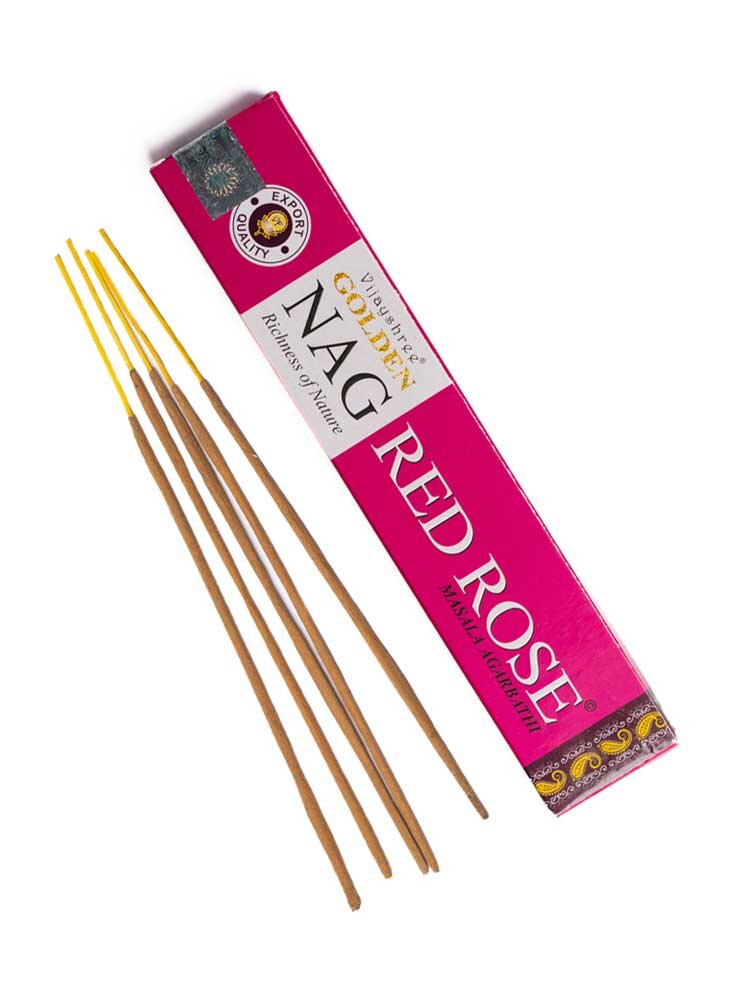 Τυλιγμένα παραδοσιακά στο χέρι, τα αρωματικά Sticks Golden Nag Red Rose περιέχουν πλουμέρια και αναμειγνύονται με ημι-υγρή ρητίνη, που προέρχεται από το δέντρο Ailanthus Malabarica, η οποία τούς δίνει αυτό το χαρακτηριστικό κρεμ χρώμα.