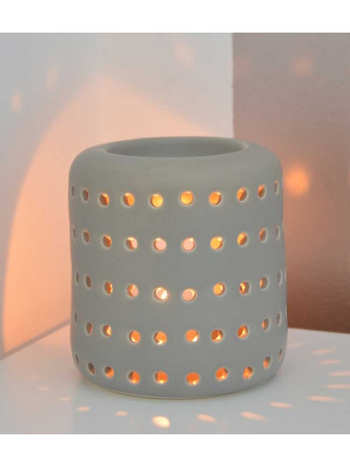 Ο καυστήρας λειτουργεί με ένα μικρό ρεσό στη βάση του, το οποίο θερμαίνει ήπια το μείγμα νερού και ελαίου που έχει τοποθετηθεί στο λεκανάκι που βρίσκεται στο πάνω τμήμα του καυστήρα, απελευθερώνοντας ένα υπέροχο άρωμα. Η απόσταση μεταξύ της φλόγας και του ελαιούχου μείγματος, όπως επίσης και το σχέδιο με τις πολλές τρυπούλες στην επιφάνειά του, είναι προσεκτικά μελετημένα, προκειμένου να επιτευχθεί η τέλεια θερμοκρασία για τη διάχυση και να διατηρηθούν οι θεραπευτικές ιδιότητες των ελαίων. Επιπλέον, μέσα από τα ανοίγματα, το φως του κεριού διαθλάται στην ατμόσφαιρα δημιουργώντας ονειρεμένους, μαγικούς σχηματισμούς. Σε ένα υπέροχο γκρι-μαύρο χρώμα ταιριαστό σε κάθε διακοσμητικό στυλ.