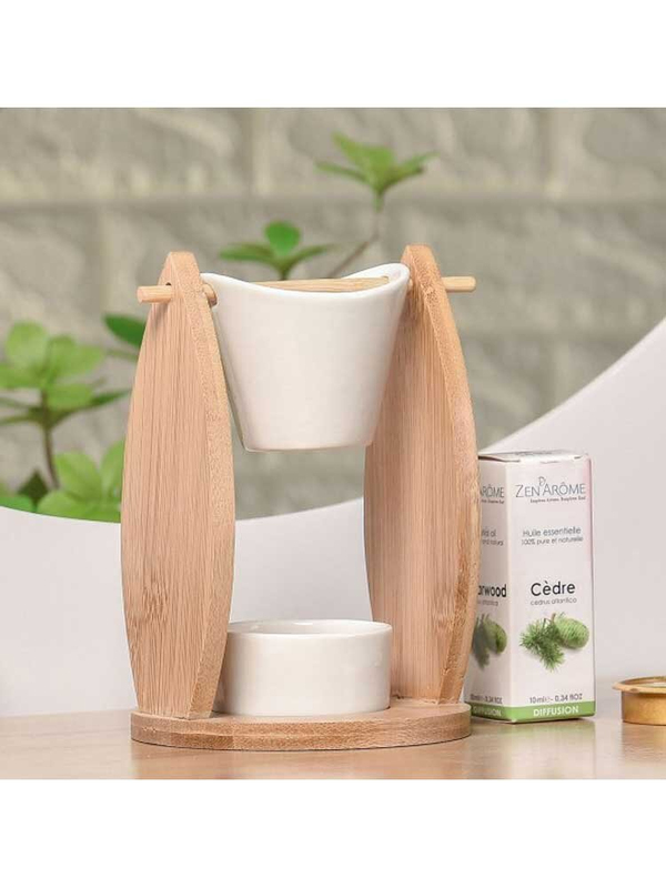 Ο καυστήρας αποτελείται από 2 κεραμικά στοιχεία, αφαιρούμενα, για εύκολο καθάρισμα, και μία ξύλινη βάση. Στο επάνω τμήμα της βάσης ένα κύπελλο υποδέχεται τα αρωματικά– και τα αιθέρια έλαια της αρεσκείας σας, ενώ στο κάτω μέρος της μία δεύτερη κεραμική θήκη φιλοξενεί διακριτικά ένα κερί τσαγιού (δεν περιλαμβάνεται), το οποίο θερμαίνει ήπια τα έλαια προκαλώντας αρωματική διάχυση.