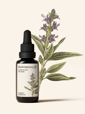 Περιέχει: δονήσεις από άνθη ἐλελίσφακου Salvia officinalis βιολογικά αιθέρια έλαια βρώσιμα: Salvia, Geranium Egyptian, αλκοόλ, φυτ. γλυκερίνη, νερό πηγής.