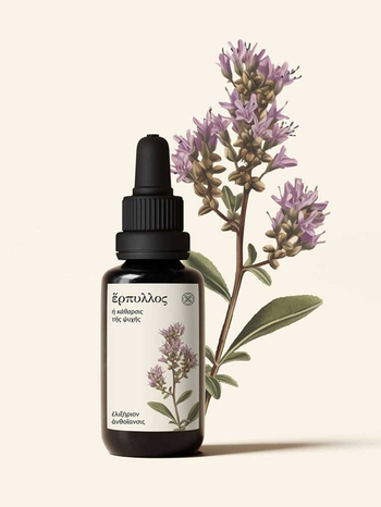 Περιέχει: δονήσεις από άνθη Thymus vulgaris, βρώσιμα βιολ. αιθέρια έλαια: Thyme, Myrrh, Mastic Chios, αλκοόλ, φυτ. γλυκερίνη, νερό πηγής.