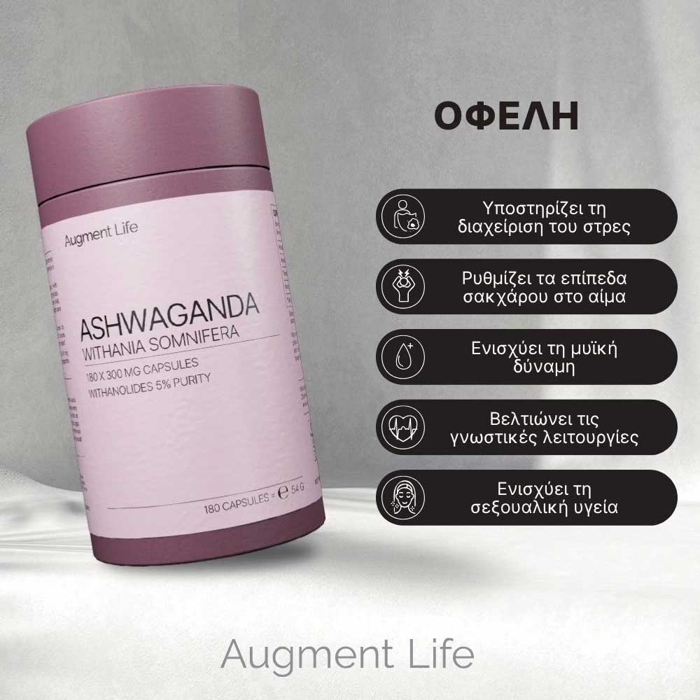 Μερικά από τα πλεονεκτήματα της Ashwagandha, είναι η μείωση των επιπέδων σακχάρου στο αίμα, η αύξηση της μυϊκής δύναμης, η ανακούφιση από το άγχος, καθώς και η βελτίωση της γνωστικής λειτουργίας. Επιπλέον, υποστηρίζεται ότι η Ashwagandha επιδρά θετικά στην ποιότητα του ύπνου, ενώ βοηθά και στην τόνωση της σεξουαλικής υγείας, αλλά και στην βελτίωση της απόδοσης (σεξουαλικής, σωματικής και πνευματικής). Έχει επιβεβαιωθεί ότι μπορεί να ενισχύσει τη λίμπιντο των γυναικών και να βελτιώσει την ανδρική γονιμότητα και τα επίπεδα τεστοστερόνης, ενώ στην τυχαιοποιημένη, διπλά τυφλή, ελεγχόμενη με εικονικό φάρμακο μελέτη των Gopal et al. (2021) αποκαλύφθηκε ότι το εκχύλισμα ρίζας Ashwagandha μείωσε αποτελεσματικά τα κλιμακτηρικά συμπτώματα στις γυναίκες κατά τη διάρκεια της περι-εμμηνόπαυσης. Επίσης, μια πρόσφατη μελέτη από τους Leonard et al. 202.,) -διερευνώντας τον αντίκτυπό του συμπληρώματος στη γνωστική λειτουργία και τη διάθεση-. απέδειξε ότι η λήψη Ashwagandha βελτίωσε την προσοχή, την εγρήγορση και τη μνήμη, ενώ παράλληλα μείωσε την ένταση και την κόπωση, ενώ οι Pérez-Gómez et al. 2020., πραγματοποιώντας συστηματική ανασκόπηση και μετα-ανάλυση, κατέδειξαν τις θετικές επιδράσεις της Ashwagandha στο VO2max (μέγιστη πρόσληψη οξυγόνου) τον κορυφαίο δείκτη αερόβιας αντοχής και καρδιοαναπνευστικής υγείας.