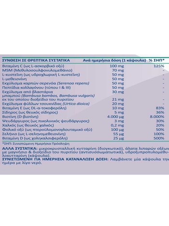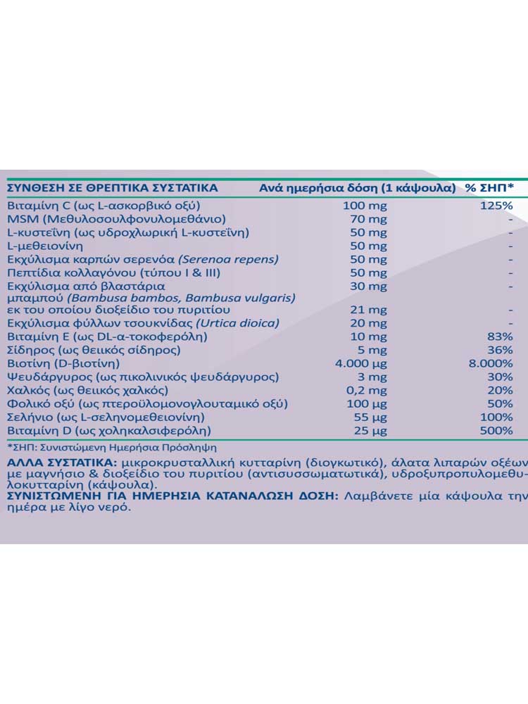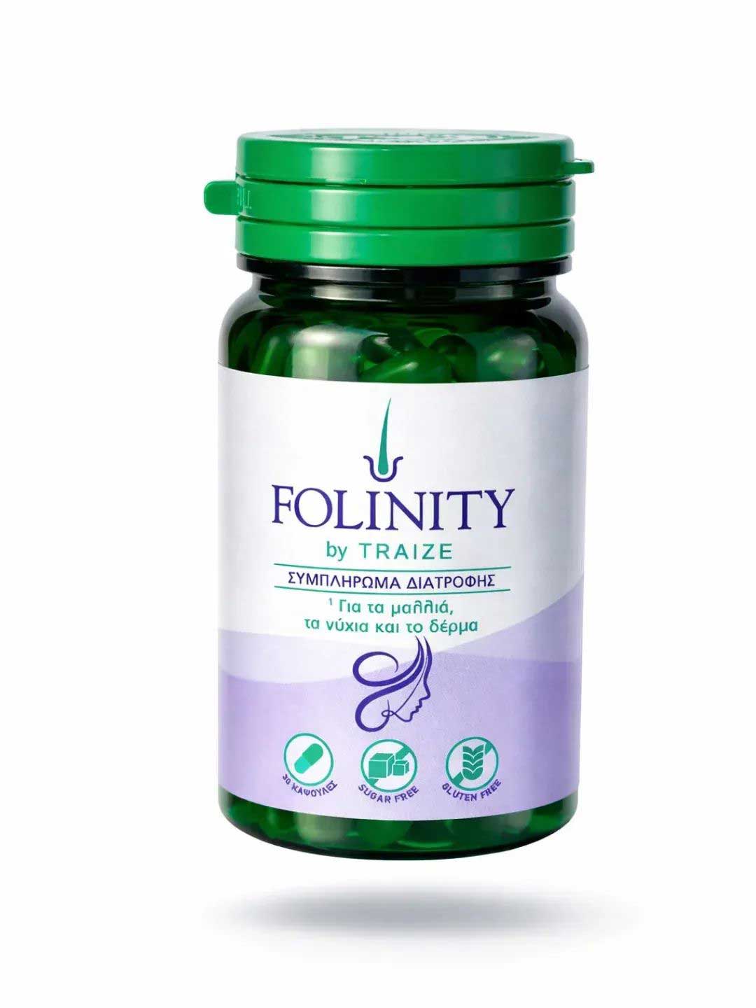 Το FOLINITY είναι ένα συμπλήρωμα διατροφής που περιέχει βιταμίνες C, Ε και D, βιοτίνη, φολικό οξύ, σίδηρο, ψευδάργυρο, χαλκό, σελήνιο, MSM, L-κυστεΐνη, L-μεθειονίνη, κολλαγόνο και εκχυλίσματα σερενόα, μπαμπού και τσουκνίδας. Η βιοτίνη, ο ψευδάργυρος, το σελήνιο και η σερενόα συμβάλλουν στη διατήρηση της φυσιολογικής κατάστασης των μαλλιών, ενώ ταυτόχρονα, ο χαλκός συμβάλλει στο φυσιολογικό χρωματισμό των μαλλιών.