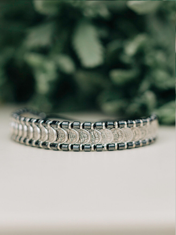 •Υλικό : κορδόνι,επάργυρα στοιχεία,μαύρες χάντρες απο αιματίτη