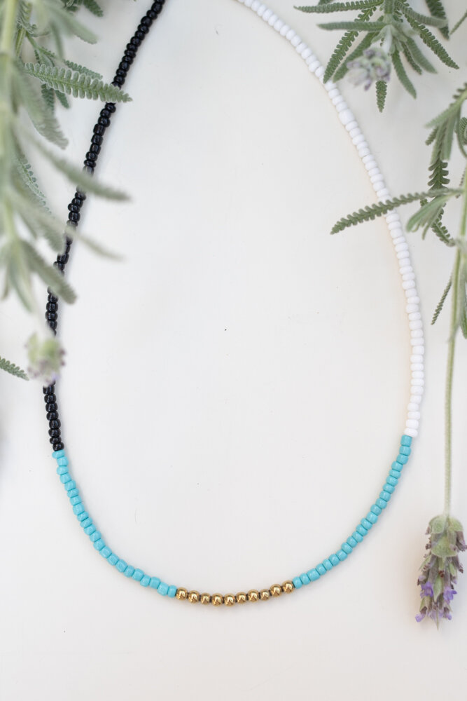 •Υλικό :Κολιέ με γυάλινες χάντρες λευκές,μαύρες,τιρκουάζ κ χάντρες αιματίτη