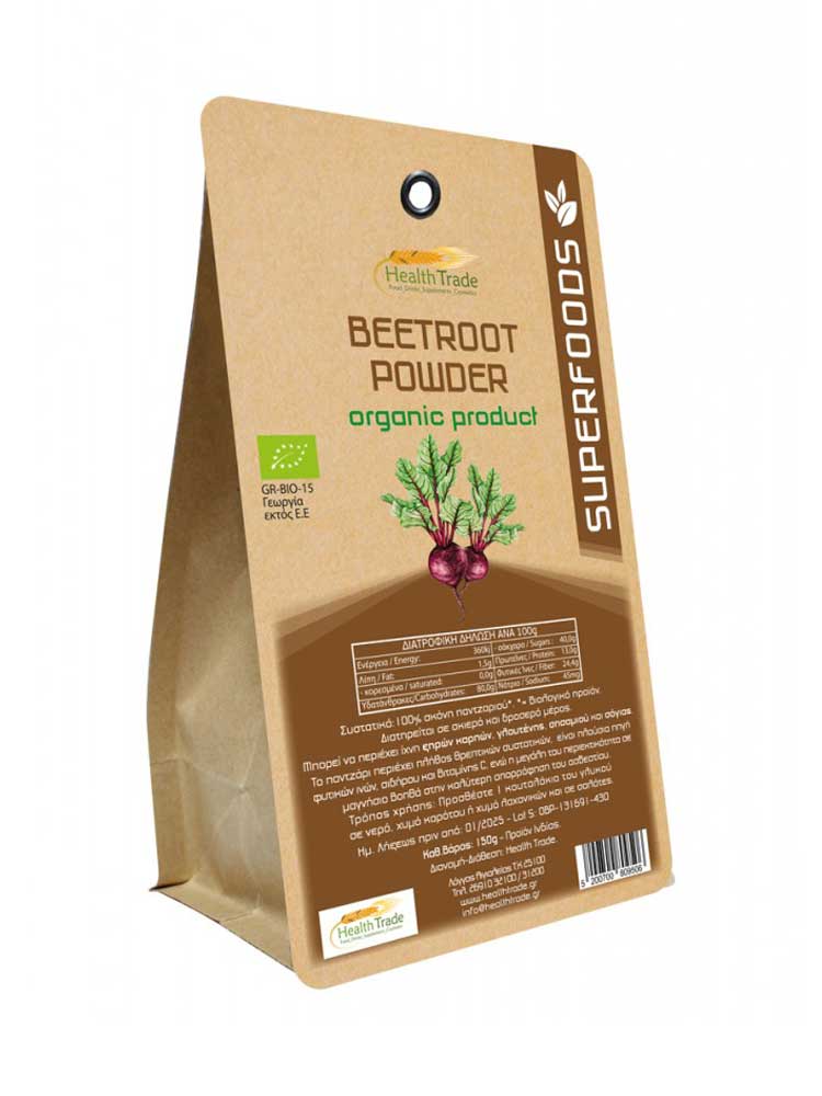 Η βιολογική σκόνη Beetrood Powder της εταιρίας HEALTH TRADE προέρχεται από την αποξηραμένη ρίζα του φυτού, η οποία είναι γνωστή για το έντονο σκούρο κόκκινο χρώμα και το πλήθος των θρεπτικών της συστατικών. Είναι πλούσια σε σίδηρο, κάλιο, μαγνήσιο, βιταμίνες Α,C, B1, B2, B3, B6, ασβέστιο, χαλκό, φώσφορο, νάτριο, ιώδιο και φυτικές ίνες, ενώ αποτελεί και σημαντική πηγή υδατανθράκων και πρωτεϊνών. Σύμφωνα με πολλές έρευνες, περιέχει υψηλή συγκέντρωση νιτρικών και νιτρωδών αλάτων συμβάλλοντας σημαντικά στη μείωση της αρτηριακής πίεσης, γεγονός που έχει θετική επίδραση στην ελαχιστοποίηση του κινδύνου καρδιακών προσβολών, καρδιακής ανεπάρκειας και εγκεφαλικού. Μελέτες σε ασθενείς με καρδιακή ανεπάρκεια έδειξαν αύξηση της μυϊκής δύναμης κατά 13% και βελτίωση στη μέγιστη πρόσληψη οξυγόνου. Σημαντική είναι η συμβολή των νιτρικών αλάτων και στην ενίσχυση της φυσικής ενέργειας και της αντοχής, ιδιαίτερα κατά τη διάρκεια της άσκησης, καθώς μειώνουν τις ανάγκες οξυγόνου καθώς και στη βελτίωση της γνωστικής λειτουργίας και εν μέρει στη μείωση του κινδύνου άνοιας, Τέλος, το παντζάρι είναι μια καλή πηγή φυτικών ινών, ουσίες ιδιαίτερα ευεργετικές για την πεπτική υγεία,