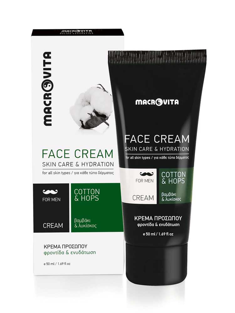 Η Ενυδατική Κρέμα Προσώπου από την ανδρική καλλυντική σειρά της Macrovita εμπλουτισμένη με βαμβάκι και λυκίσκο και έναν ευεργετικό συνδυασμό ενεργών συστατικών φυσικής προέλευσης ενυδατώνει, δυναμώνει, αναζωογονεί το δέρμα, καταπραΰνει τους ερεθισμούς και τα σημάδια της γήρανσης και χαρίζει στην επιδερμίδα μοναδική απαλότητα, φρεσκάδα και λάμψη. Μία ανάλαφρη, μη λιπαρή, εύκολα απορροφήσιμη κρέμα Κατάλληλη για όλους τους τύπους δέρματος