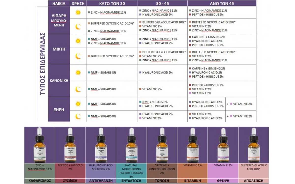 Σχεδιασμένη με απόλυτο σεβασμό για το δέρμα και το περιβάλλον, η σειρά Elementa αποτελεί την καλύτερη επιλογή για τον σύγχρονο, απαιτητικό καταναλωτή, ο οποίος αναζητά όλο και συχνότερα αγνά, φυσικά προϊόντα, εξατομικευμένα στις δικές του, ιδιαίτερες ανάγκες, 8 ενεργά συστατικά σε συμπυκνωμένη μορφή για να μπορείτε να επιλέγετε τους καλύτερους δυνατούς συνδυασμούς για την καθημερινή φροντίδα της επιδερμίδας σας!