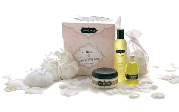 Η πολυτελής συσκευασία του Sweet Celebration, που θα σας μαγέψει με τα αρώματα που τη συνοδεύουν, περιέχει: French Vanilla Crème Body Soufflé, Pleasure Garden Massage Oil, Vanilla Crème Oil of Love, Sweet Honeysuckle Boudoir Puff and Rose Petal Sachet.