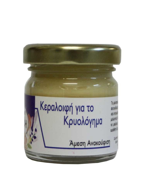 Το Μελισσοκέρι και το Μέλι διαθέτουν πολύτιμες αντισηπτικές και απαλυντικές ιδιότητές, οι οποίες σε συνδυασμό με την ισχυρή αντιφλεγμονώδη και αντιμικροβιακή δράση του Βαλσαμέλαιου και τις αντιοξειδωτικές, αναπλαστικές και μαλακτικές ιδιότητες του Αγριέλαιου λειτουργούν επουλωτικά ανακουφίζοντας από το κνησμό στην ερεθισμένη περιοχή και χαρίζουν εντατική ενυδάτωση, θρέψη και προστασία στην επιδερμίδα. Το Θυμάρι, ο Ευκάλυπτος και η Μέντα, συστατικά γνωστά για τις αντισηπτικές, αναλγητικές και αντιβακτηριδιακές τους ιδιότητες περιέχουν ισχυρούς αποσυμφορητικούς παράγοντες, οι οποίοι διευκολύνουν την αναπνοή και ανακουφίζουν από το βήχα, τον πονόλαιμο και τους μυϊκούς πόνους που προκαλούνται από το κρυολόγημα. Το Κάρδαμο έχει πλούσιες αντιβακτηριδιακές, αντισηπτικές και αντισπασμωδικές ιδιότητες και θεωρείται ιδανικό για περιπτώσεις επίμονου βήχα και βρογχίτιδας. Τέλος, το Λεμόνι, με τις ισχυρές αντισηπτικές του ιδιότητες και την αναζωογονητική του ευωδιά, χαρίζει ένα φρέσκο και δροσερό άρωμα στην κρέμα.