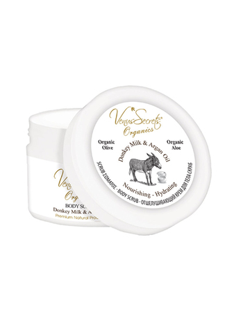 Πλούσιo scrub σώματος με γάλα γαϊδούρας και έλαιο άργκαν, της εταιρίας Venus Secrets Organics για βαθύ καθαρισμό, τόνωση και ενυδάτωση. Η μοναδική του σύνθεση με ενεργούς φυσικούς παράγοντες απομακρύνει αποτελεσματικά τα νεκρά κύτταρα, βελτιώνει την μικροκυκλοφορία και τονώνει την επιδερμίδα, αφήνοντας την αναζωογονημένη, λεία και απαλή. Αναγνωρισμένο για τις εξαιρετικές αρετές του, πλούσιο σε θρεπτικά συστατικά, βιταμίνες Α, Β, C και πολυακόρεστα λιπαρά οξέα, το γάλα γαϊδούρας είναι ένα φυσικό συστατικό που προωθεί την αναγέννηση του δέρματος. Παράλληλα, το έλαιο αργκάν, ο πολύτιμος αυτός θησαυρός της φύσης, με τις άριστες αντιβακτηριαδιακές και καταπραϋντικές ιδιότητες, απαλύνει το δέρμα από τυχόν κοκκινίλες και ερεθισμούς, αναπλάθει τα κύτταρα, επαναφέρει την ελαστικότητά του δέρματος και συμβάλλει στην σύσφιξη του, χαρίζοντας στην επιδερμίδα όμορφη και νεανική όψη. Εμπλουτισμένο, επιπλέον, με βιολογικό ελαιόλαδο και βιολογική αλόη το scrub της Venus Secrets είναι ένα άριστο προϊόν ανάπλασης και θρέψης της επιδερμίδας.