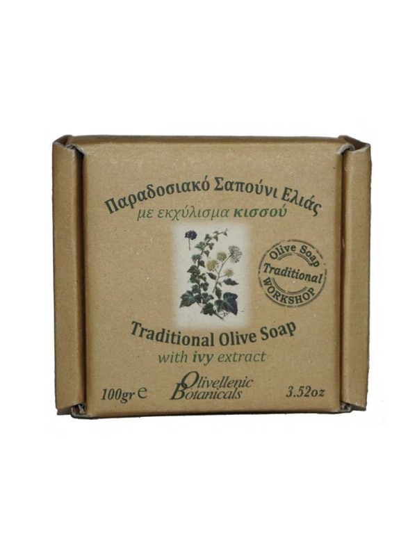 Το παραδοσιακό χειροποίητο σαπούνι ελαιολάδου με εκχύλισμα κισσού της εταιρίας Olivellenic Organics έχει σύνθεση πλούσια σε βιταμίνη Ε, εκχύλισμα ευκαλύπτου και φασκόμηλου, συστατικά τα οποία είναι γνωστά για την αντιμυκητιακή, αντισηπτική και επουλωτική τους δράση. Ο πλούσιος, κρεμώδης αφρός του ξεχωριστού αυτού προϊόντος καθαρίζει σε βάθος, χαρίζοντας λάμψη και υγεία, ενώ ξεπλένεται εύκολα χωρίς να αφήνει κατάλοιπα. Είναι ιδανικό για όλους τους τύπους δέρματος, ακόμη και για τα πλέον ευαίσθητα, ενώ συμβάλλει αποτελεσματικά στην μείωση της κυτταρίτιδας και του λίπους. Κατάλληλο για το σώμα. (Αφού κάνετε ένα ζεστό μπάνιο ή ντους, τρίψτε απαλά το σαπούνι, κάνοντας κυκλικές κινήσεις, πάνω στα σημεία που εμφανίζεται κυτταρίτιδα). Πωλείται σε χάρτινη, οικολογική και βιοδιασπώμενη συσκευασία των 100γρ.
