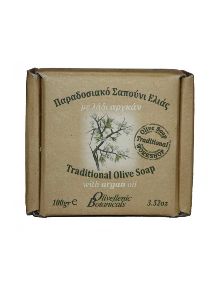 Το παραδοσιακό χειροποίητο σαπούνι ελαιολάδου με λάδι αργκάν της εταιρίας Olivellenic Organics έχει σύνθεση πλούσια σε βιταμίνη Ε, εκχύλισμα ευκαλύπτου και φασκόμηλου, συστατικά τα οποία είναι γνωστά για την αντιμυκητιακή, αντισηπτική και επουλωτική τους δράση. Ο πλούσιος, κρεμώδης αφρός του ξεχωριστού αυτού προϊόντος καθαρίζει σε βάθος, χαρίζοντας λάμψη και υγεία, ενώ ξεπλένεται εύκολα χωρίς να αφήνει κατάλοιπα. Είναι ιδανικό για όλους τους τύπους δέρματος, ακόμη και για τα πλέον ευαίσθητα, ενώ έχει έντονα αναπλαστική και αντιγηραντική δράση. Κατάλληλο για το πρόσωπο και το σώμα. Πωλείται σε χάρτινη, οικολογική και βιοδιασπώμενη συσκευασία των 100γρ.