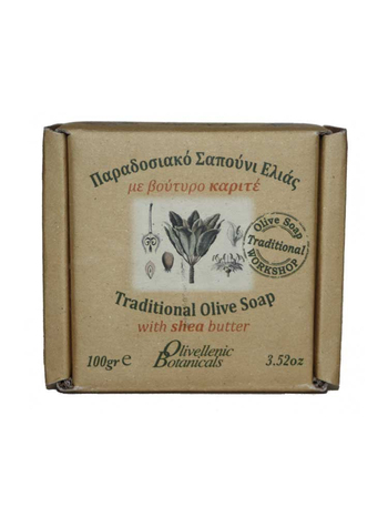 Το παραδοσιακό χειροποίητο σαπούνι ελαιολάδου με βούτυρο καριτέ (shea butter) της εταιρίας Olivellenic Organics έχει σύνθεση πλούσια σε βιταμίνη Ε, εκχύλισμα ευκαλύπτου και φασκόμηλου, συστατικά τα οποία είναι γνωστά για την αντιμυκητιακή, αντισηπτική και επουλωτική τους δράση. Ο πλούσιος, κρεμώδης αφρός του ξεχωριστού αυτού προϊόντος καθαρίζει σε βάθος, χαρίζοντας λάμψη και υγεία, ενώ ξεπλένεται εύκολα χωρίς να αφήνει κατάλοιπα. Είναι ιδανικό για όλους τους τύπους δέρματος, ακόμη και για τα πλέον ευαίσθητα, ενώ έχει έντονα αναπλαστική και αντιγηραντική δράση. Κατάλληλο για το πρόσωπο, το σώμα και τα μαλλιά. Πωλείται σε χάρτινη, οικολογική και βιοδιασπώμενη συσκευασία των 100γρ.