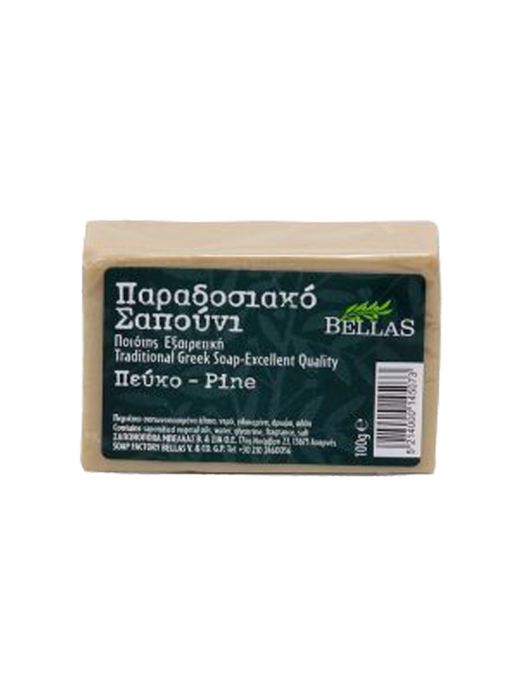 Παραδοσιακό, χειροποίητο σαπούνι με ελαιόλαδο και πεύκο από την εταιρία Bellas. Το ελαιόλαδο περιέχει ισχυρούς θρεπτικούς παράγοντες, οι οποίοι αναπλάθουν και αναζωογονούν την επιδερμίδα, βοηθώντας την ταυτόχρονα να διατηρεί την ελαστικότητα της. Το αιθέριο έλαιο πεύκο είναι ιδανικό για την καταπολέμηση της κυτταρίτιδας, καθώς συμβάλλει στην τόνωση της κυκλοφορίας του αίματος, ενώ θεωρείται ένα ιδιαίτερα ισχυρό αντιρυτιδικό, το οποίο προστατεύει τα κύτταρα από τις ελεύθερες ρίζες που ευθύνονται για τη γήρανση - περιέχει 5 φορές περισσότερη βιταμίνη C από το πορτοκάλι. Επιπλέον, ασκεί σημαντική αντιμηκητιακή δράση, ενώ είναι ιδιαίτερα ευεργετικό και για τα μαλλιά, καθώς ρυθμίζει την λιπαρότητα του τριχωτού της κεφαλής, δυναμώνει και θρέφει την ρίζα και δρα κατά της τριχόπτωσης. Το αναζωογονητικό του άρωμα χαρίζει μία υπέροχη αίσθηση καθαριότητας. Αποτελεσματικό και στην αντιμετώπιση των κατακλίσεων