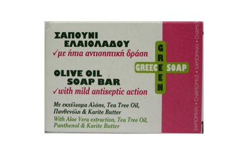 Σαπούνι Ελαιολάδου με ήπια αντισηπτική δράση Elaa Olive Line Mild Antiseptic εμπλουτισμένο με εκχύλισμα Αλόης, έλαιο Τεϊόδεντρου, Πανθενόλη, Βούτυρο Καριτέ και υπέροχο άρωμα Χαμομήλι.