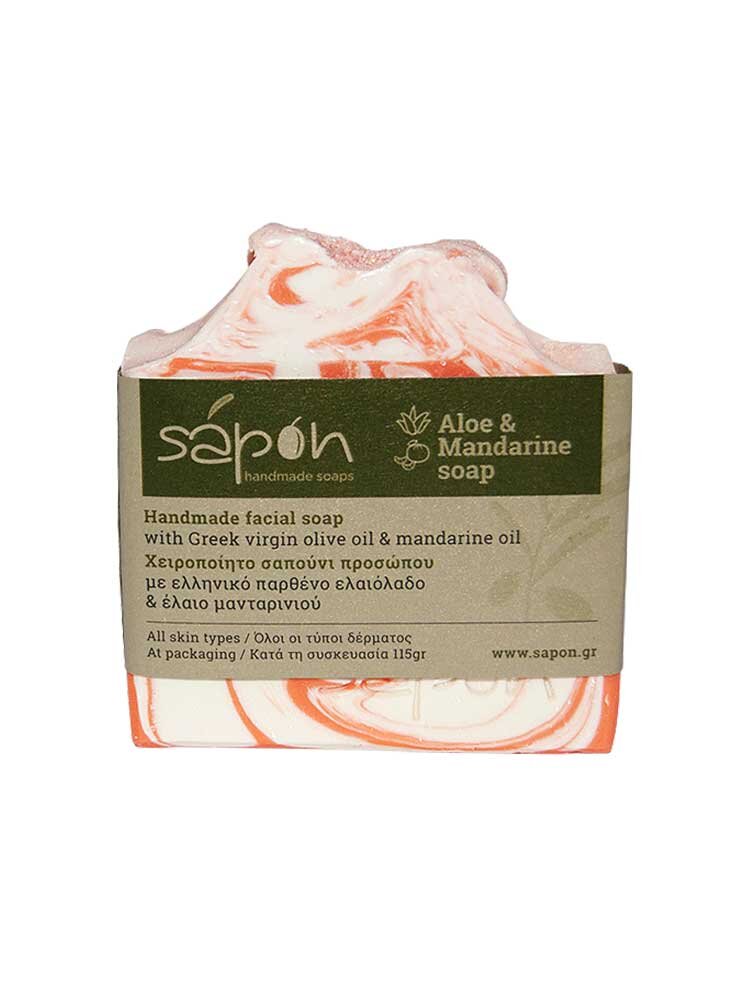 Χειροποίητο σαπούνι προσώπου εμπλουτισμένο με ελληνικό παρθένο ελαιόλαδο, αλόη και μανταρίνι από την εταιρία Sapon Skin Care. Ένα μοναδικό προιόν φροντίδας και περιποίησης της επιδερμίδας, πλούσιο σε δραστικά, φυσικά συστατικά, το οποίο θα καθαρίσει απαλά, θα θρέψει και θα ενυδατώσει το δέρμα σας, χαρίζοντάς του απαλότητα, φρεσκάδα και λάμψη.