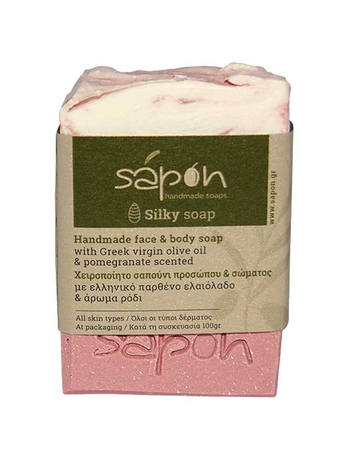 Χειροποίητο σαπούνι εμπλουτισμένο με ελληνικό παρθένο ελαιόλαδο, βούτυρο καριτέ, βούτυρο κακάο, ίνες μεταξιού και υπέροχο άρωμα ρόδι, από την εταιρία Sapon Skin Care.