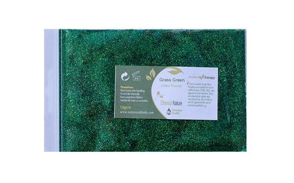 To Grass Green Glitter είναι ένα ιδιαίτερα φωτεινό και ζωηρό χρώμα με έντονους μαργαριταρένιους ιριδισμούς σε τόνους πράσινο ανοικτό, το οποίο μας παραπέμπει στον μαγικό κόσμο των ωκεανών, εκεί όπου ζουν γοργόνες και άλλα μυθικά πλάσματα της φαντασίας μας. Χαρίζει ελαφριά προς μεσαία κάλυψη και υψηλή λάμψη (shimmer). Το χρώμα Grass Green είναι κατάλληλο για όλα τα καλλυντικά (Face, Eyes, Nails, Lips). Το μέγεθος του κόκκου κυμαίνεται μεταξύ 10-60 microns.