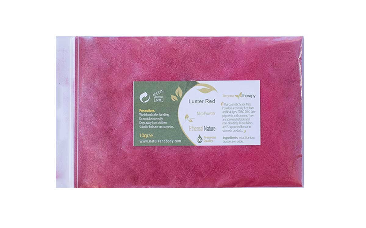 Το Luster Red Mica είναι ένα έντονο ροζ-κόκκινο με ζωηρούς, ασημί ιριδισμούς που θα χαρίσει λάμψη και ζωντάνια σε όλες σας τις δημιουργίες. Προσφέρει καλή, μεσαία κάλυψη και αντίστοιχη λάμψη (shimmer). Το χρώμα Luster Red είναι κατάλληλο για όλα τα καλλυντικά (Face, Eyes, Nails, Lips). Το μέγεθος του κόκκου κυμαίνεται μεταξύ 10-60 microns.