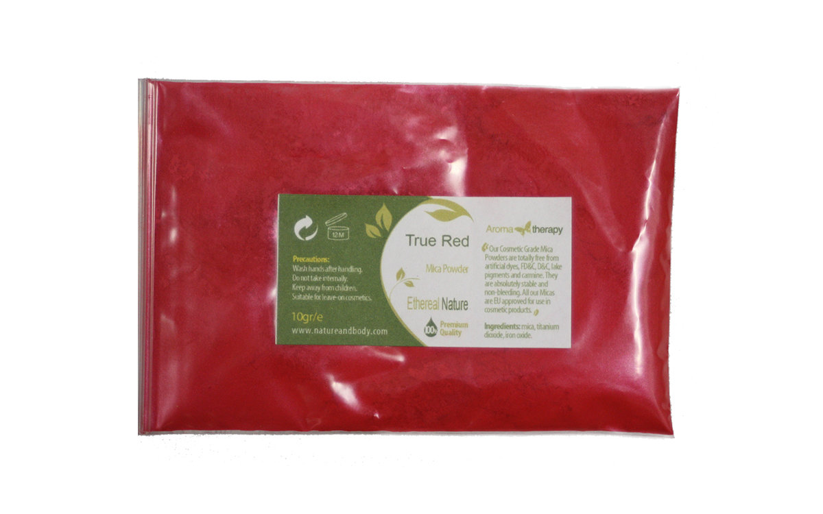 Η Mica True Red έχει ένα έντονο κόκκινο χρώμα, με ασημένιους τόνους που δίνει ένα ελαφρώς μεταλιζέ αποτέλεσμα, με ιδιαίτερη λάμψη. Χαρίζει υψηλή κάλυψη και αντίστοιχη λάμψη (shimmer). Το χρώμα True REd είναι κατάλληλο για όλα τα καλλυντικά (Face, Eyes, Nails, Lips). Το μέγεθος του κόκκου κυμαίνεται μεταξύ 10-60 microns.