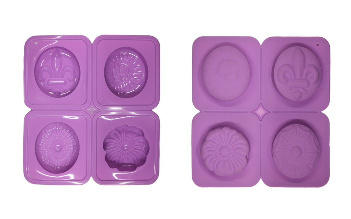 Η φόρμα σιλικόνης 4 “Μεγάλα λουλούδια” (3 οβάλ και 1 στρογγυλό με καμπυλώσεις) μπορεί να χρησιμοποιηθεί για να παρασκευάσετε σοκολάτες, τάρτες, ατομικά γλυκά, αλλά και για σαπούνια και κεριά με "ιδιαίτερο" ύφος. Όταν χρησιμοποιείται για την παρασκευή σαπουνιών (με χρήση έτοιμης βάσης σαπουνιού), το βάρος κάθε "κυψέλης" είναι περίπου 87gr.