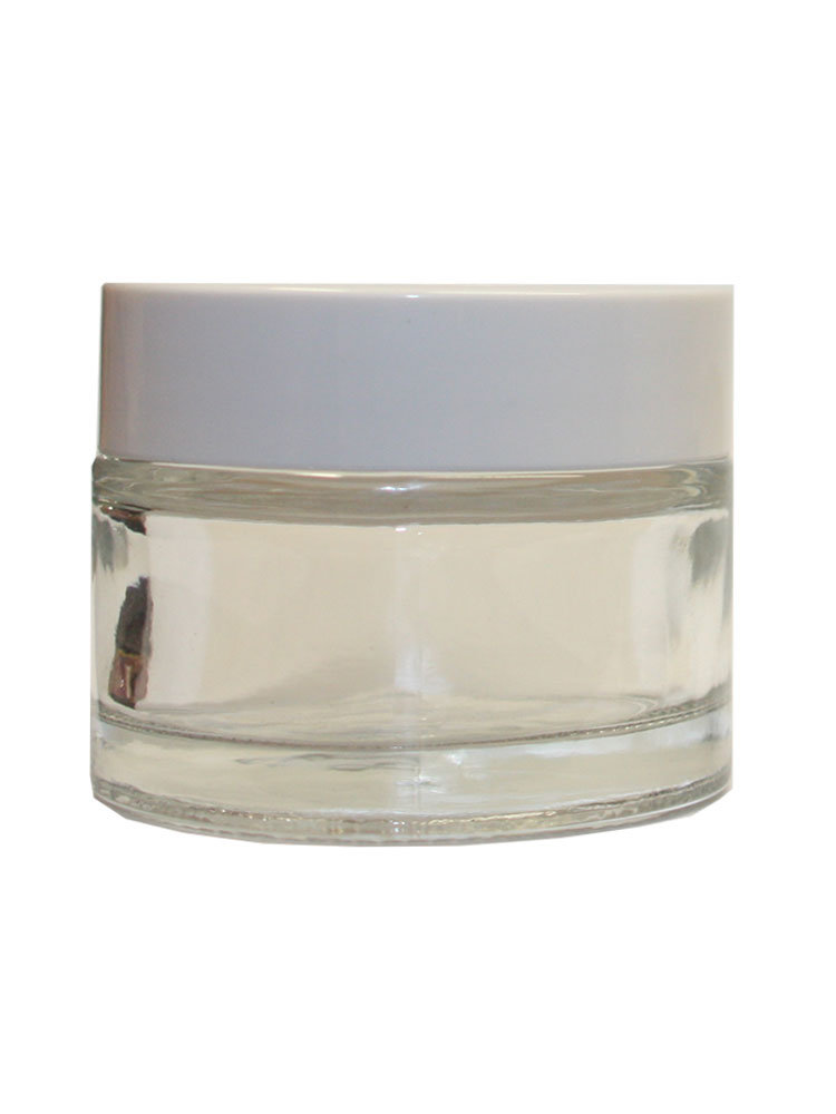 Διάφανο γυάλινο βαζάκι με εσωτερικό επίπωμα που κλείνει με λευκό πώμα από βακελίτη.