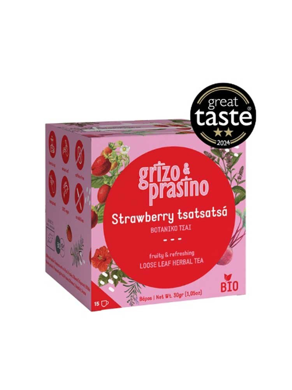 Αποξηραμένα φύλλα δυόσμου και δενδρολίβανου αναμεμειγμένα με κομμάτια φράουλας, άνθη ιβίσκου και παντζάρι αποδίδουν ένα εύγευστο μίγμα που ακόμη και ζεστό θυμίζει καλοκαίρι. Το πρώτο φραουλένιο μίγμα της Grizo & Prasino είναι γεγονός και είναι ίσως πιο νόστιμο και από τη γρανίτα φράουλα των παιδικών μας χρόνων. Ίσως και λίγο πιο ξινό και στυφό γιατί έχει ιβίσκο. Ίσως και λίγο πιο δροσερό γιατί έχει δυόσμο. Και πιο βοτανικό γιατί έχει δενδρολίβανο. Σίγουρα όμως το πιο κόκκινο και λαχταριστό από όλα. Ένα δεν είναι ποτέ αρκετό!
