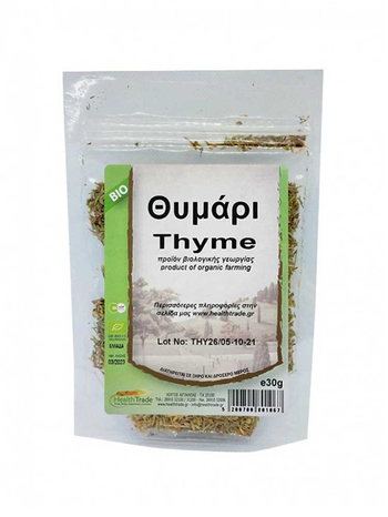Μια από τις ίσως λιγότερο διαδεδομένες χρήσεις του θυμαριού είναι σε μορφή ροφήματος. Ως αντιβακτηριδιακό είναι ιδανικό για γαργάρες (καλύτερα να μην προσθέσετε μέλι ή ζάχαρη για αυτή τη χρήση) για καλή στοματική υγιεινή, ενώ βοηθά και στη θεραπεία του βήχα και του πονόλαιμου. Το βιολογικό θυμάρι της εταιρίας εταιρίας Health Trade καλλιεργείται με απολύτως φυσικές και πιστοποιημένες βιολογικές μεθόδους. Διατίθεται τριμμένο σε χάρτινη συσκευασία (30g). Προϊόν Βιολογικής Γεωργίας.