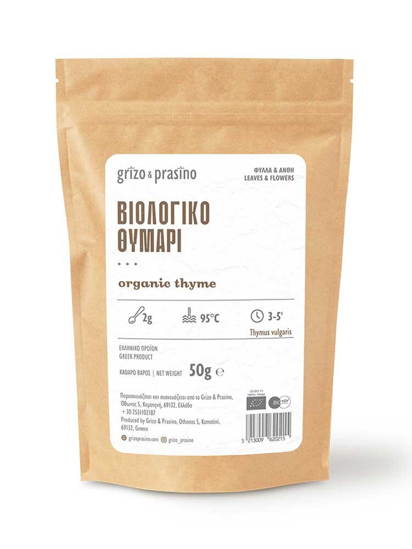 Μια από τις ίσως λιγότερο διαδεδομένες χρήσεις του θυμαριού είναι σε μορφή ροφήματος. Ως αντιβακτηριδιακό είναι ιδανικό για γαργάρες (καλύτερα να μην προσθέσετε μέλι ή ζάχαρη για αυτή τη χρήση) για καλή στοματική υγιεινή, ενώ βοηθά και στη θεραπεία του βήχα και του πονόλαιμου. Το βιολογικό θυμάρι της εταιρίας εταιρίας Grizo & Prasino καλλιεργείται με απολύτως φυσικές και πιστοποιημένες βιολογικές μεθόδους. Διατίθεται τριμμένο σε χάρτινη συσκευασία (50g). Προϊόν Βιολογικής Γεωργίας.