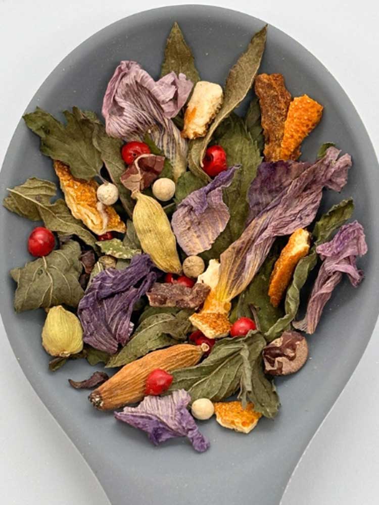 Η μέντα είναι καταπραϋντική για το ερεθισμένο στομάχι, ενώ διαθέτει και πλούσιες αντιβιοτικές, αντιμυκητιακές και αντιϊκές ιδιότητες. Επιπλέον, εξαιτίας της χαλαρωτικής της δράσης χρησιμοποιείται για την καταπολέμηση των πονοκεφάλων, του άγχους που συνδέεται με κατάθλιψη, της ναυτίας, των πόνων της έμμηνου ρύσης και του μετεωρισμού. Οι κόκκοι κακάο χαρίζουν στο μίγμα γήινη γλυκύτητα, ενώ τα μπαχαρικά προσθέτουν το χριστουγεννιάτικο twist που ξεχωρίζει. Τέλος, τα κομμάτια πορτοκαλιού και τα πέταλα αλθαίας αρωματίζουν υπέροχα το ρόφημα, αποδίδοντάς του απαράμιλλη γεύση. Ένα γιορτινό μίγμα με έντονη προσωπικότητα που θα λατρέψετε!